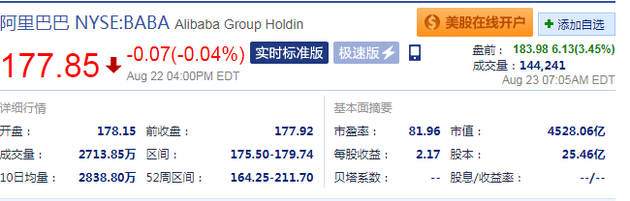 新浪科技讯 北京时间8月23日晚间消息,阿里巴巴(NYSE:BABA)盘前股价上涨6.13美元,涨至183.98美元每股,涨幅达3.45%。目前,阿里巴巴市值为4528.06亿美元。ZDx邯郸市新元素网络公司