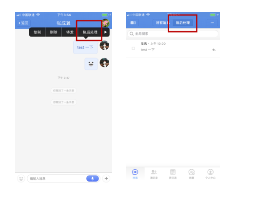 ●增加了稍后处理功能。和好友的对话中常常聊到之后要处理的事情或工作,如果怕忘记,可以点击“稍后处理功能”,标记后的功能将以待办事项的形式被放到稍后处理栏下。非常实用,拯救记忆力不好星人。