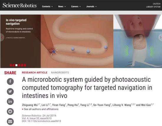 这项合作完成的突破今天以An ingestible microrobtic system using photoacoustic imaging for targeted navigation in intestine为题,发表于Science Robotics,引起微纳机器人界的广泛关注。